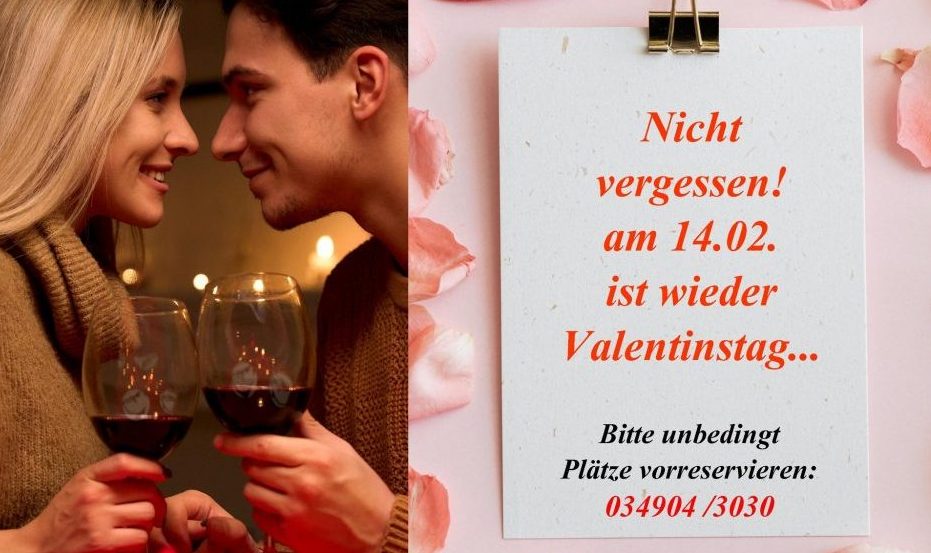 2026-02-14 Am 14. Februar ist Valentinstag! Am 14. Februar ist Valentinstag! 14. Februar Am 14. Februar ist Valentinstag! Nicht vergessen! Am 14. Februar ist wieder Valentinstag. Verwöhnen Sie Ihre Liebste oder Ihren Liebsten mit einem schönen Abend bei Kerzenschein und ausgewählten Spezialitäten. Zum Valentinstag kreiert unser Küchenteam zusätzlich zur vielseitigen Speisekarte wieder ein spezielles Valentinsmenü für Sie.